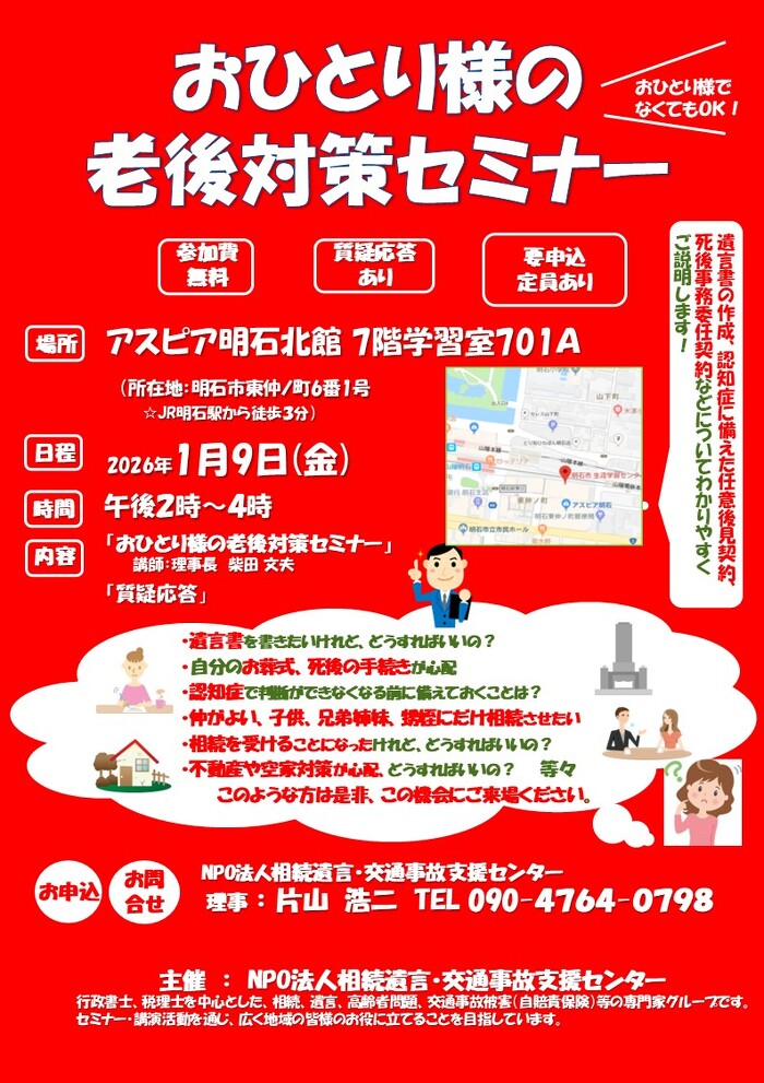 ◇日 時 令和8年1月9日(金)PM2:00~ ◇内 容 「おひとり様の老後対策セミナー」 講師:理事長 柴田 文夫 「無料質疑応答」 ◇お申込み・お問い合わせ 柴田 文夫 080-3100-0809 ホームぺージからもどうぞ