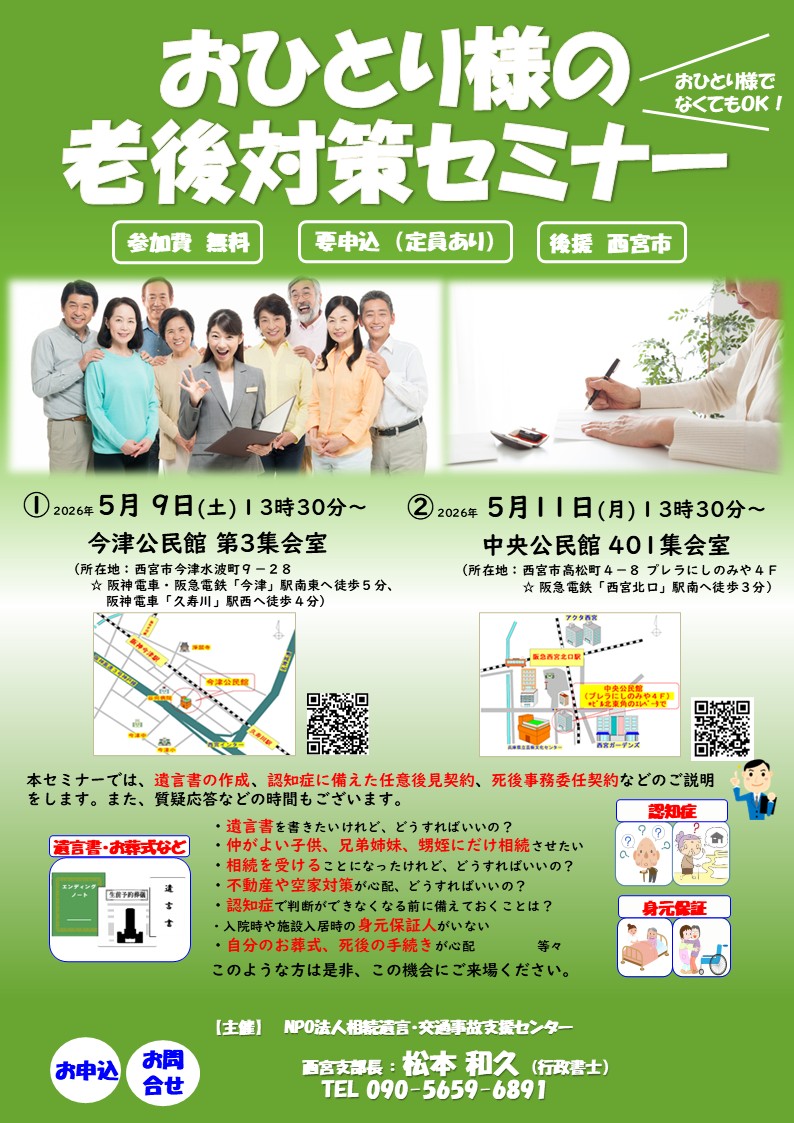 5/9・11 おひとり様の老後対策セミナー(西宮市)
