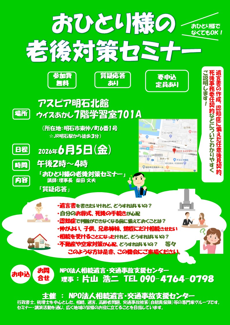 ◇日 時 令和8年6月5日(金)PM2:00~ ◇内 容 「おひとり様の老後対策セミナー」 講師:理事長 柴田 文夫 「無料質疑応答」 ◇お申込み・お問い合わせ 柴田 文夫 080-3100-0809 ホームぺージからもどうぞ