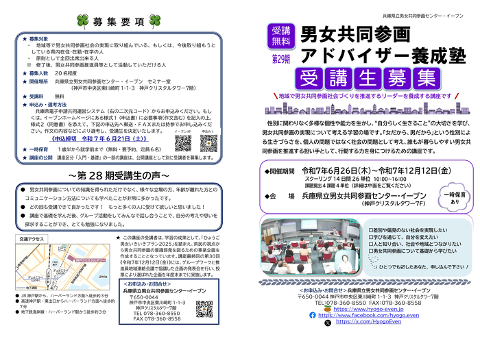 申込方法:兵庫県電子申請共同運営システム(リーフレットの二次元コード)からお申込みください。もしくは、イーブンホームページにある様式1(申込書)に必要事項(作文含む)を記入の上、様式2(同意書)を添えて、下記の申込先へ郵送・FAXまたは持参でお申し込みください。作文の内容などにより選考し、受講生を決定いたします。