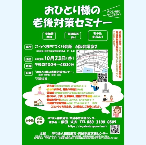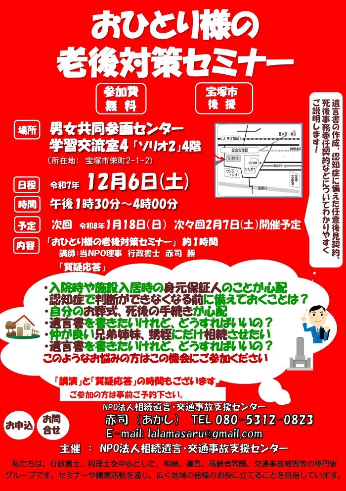 内容:おひとり様の老後対策セミナー 講演約1時間 講師:当NPO理事 行政書士 赤司 勝
