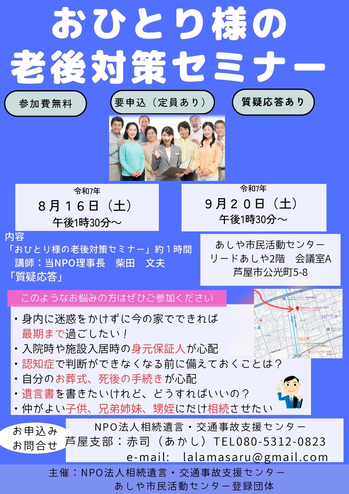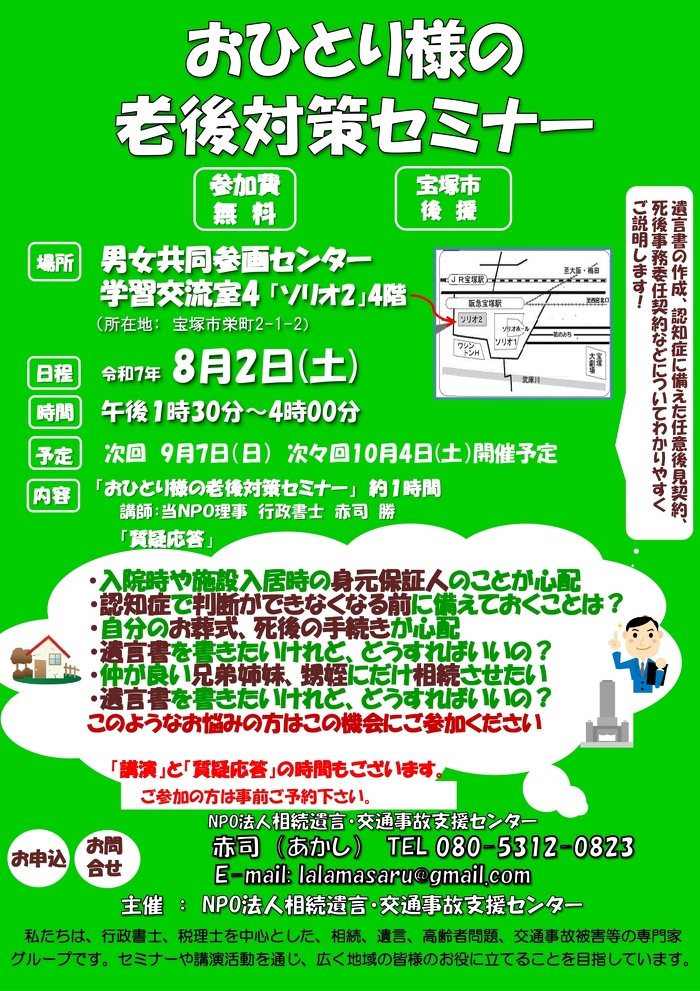 内容:おひとり様の老後対策セミナー 講演約1時間  講師:当NPO法人理事 行政書士 赤司 勝