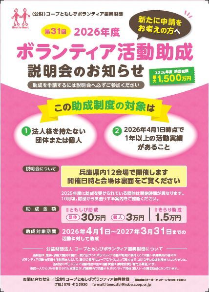 ※助成説明会の詳細は、当財団ホームページ「2026年度ボランティア活動助成説明会のお知らせ」をご覧ください。