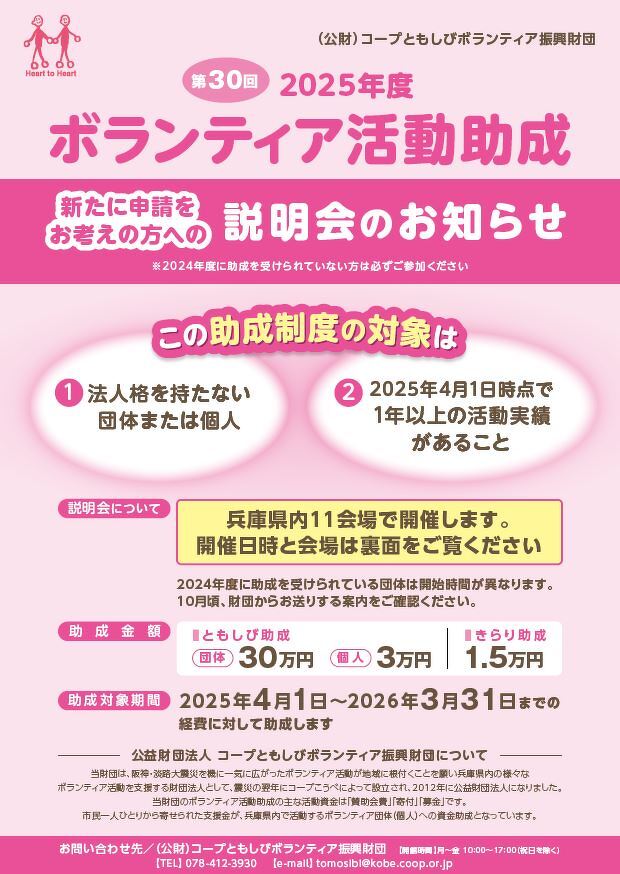 ▷詳細は、財団ホームページ「2025年度ボランティア活動助成説明会のお知らせ」をご覧ください。