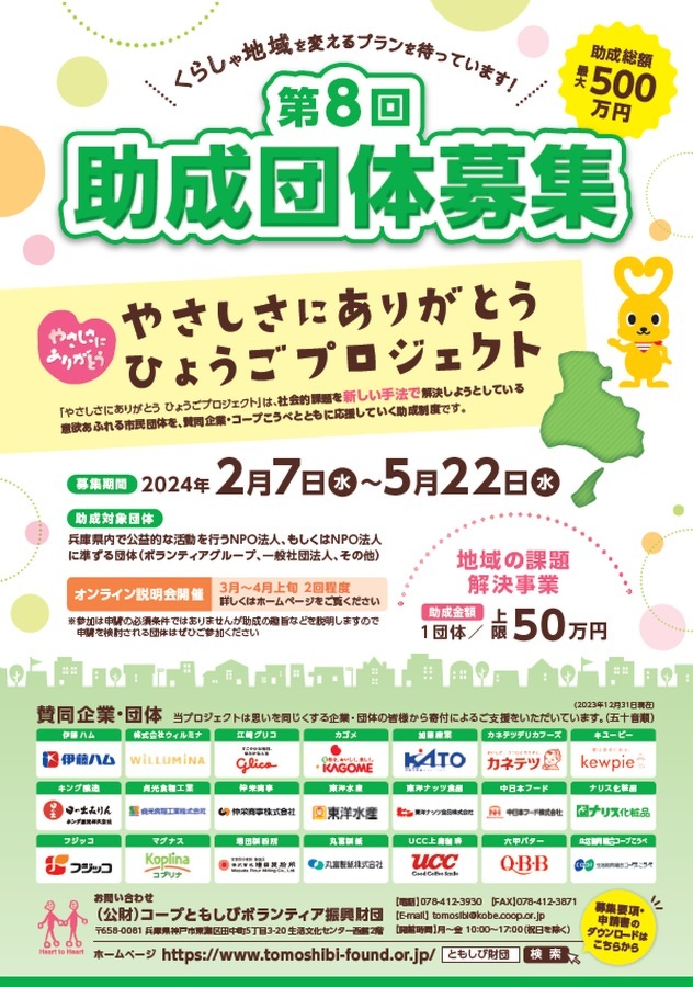 「やさしさにありがとう ひょうごプロジェクト」は、社会的課題を新しい手法で解決しようとしている意欲あふれる市民団体を、賛同企業・コープこうべとともに応援していく助成制度です。人と人とが助け合い、支え合い、誰もが安心して地域の中でくらせるように取り組む活動を助成します。