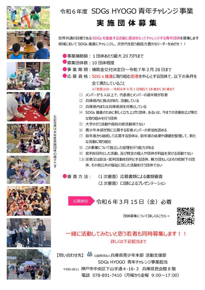 ▶応募の詳細は、兵庫県青少年本部SDGsHYOGO青年チャレンジ事業のホームページをご覧ください。