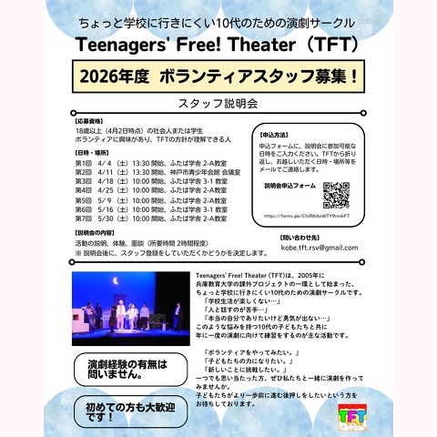 演劇経験の有無は問いません。子どもと関わりたい方、演劇に興味がある方、少しでもTFTの内容に興味がありましたら、ぜひスタッフ説明会にご参加ください。