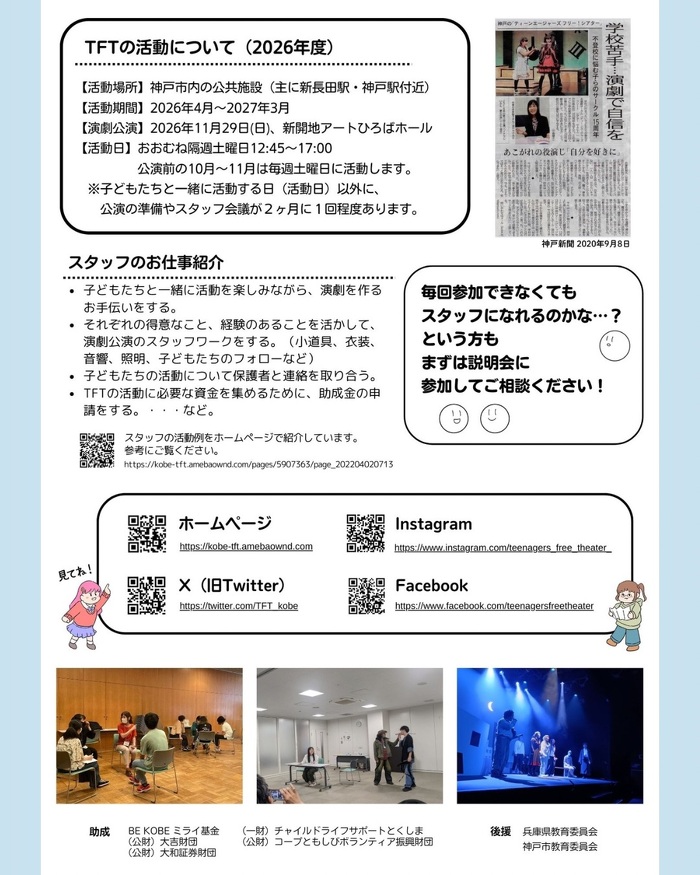 演劇経験の有無は問いません。子どもと関わりたい方、演劇に興味がある方、少しでもTFTの内容に興味がありましたら、ぜひスタッフ説明会にご参加ください。
