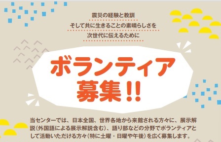 人と防災未来センターでは、日本全国・世界各地から訪れる方々に阪神・淡路大震災の経験と教訓をわかりやすく伝えるため、展示解説(外国語等による解説を含む)、語り部などの分野でボランティアの方々に活動いただいています。