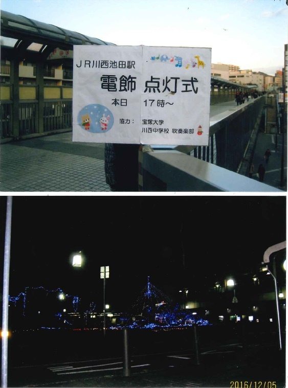 阪急川西能勢口駅及びJR川西池田駅周回路、周辺道の不法駐輪の対応、違反広告物撤去、花壇の維持、道路管理、電飾事業、安全・安心活動を現在進行中。 12月3日 第10回目の電飾点灯式を行う
