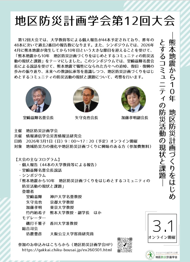 第12回大会では、大学教員等による個人報告が44本予定されており、昨年の48本に次いで過去2番目の報告数になります。また、シンポジウムでは、2026年4月に熊本地震が発生してから10年目という大きな節目を迎えることを受けて、「熊本地震から10年 地区防災計画づくりをはじめとするコミュニティの防災活動の現状と課題」をテーマにしました。このシンポジウムでは、室﨑益輝名誉会長による説話を受けて、熊本地震で犠牲になられた方々への追悼、復旧・復興の歩みの振り返り、未来への教訓伝承等を意識しつつ、地区防災計画づくりをはじめとするコミュニティの防災活動の現状と課題について、考察を行います。