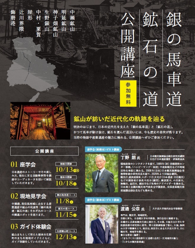 日本遺産に認定されている「播但貫く、銀の馬車道 鉱石の道」の魅力を広く住民の方々に伝え、そのストーリーを伝える人材となる方を発掘することを目的に、次の講座を開催します。