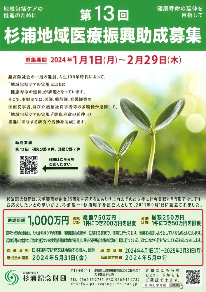 医師、薬剤師、看護師等の医療従事者、及び介護福祉従事者等の多職種が連携して、「地域包括ケアの実現」「健康寿命の延伸」の推進に寄与する研究を助成します。
