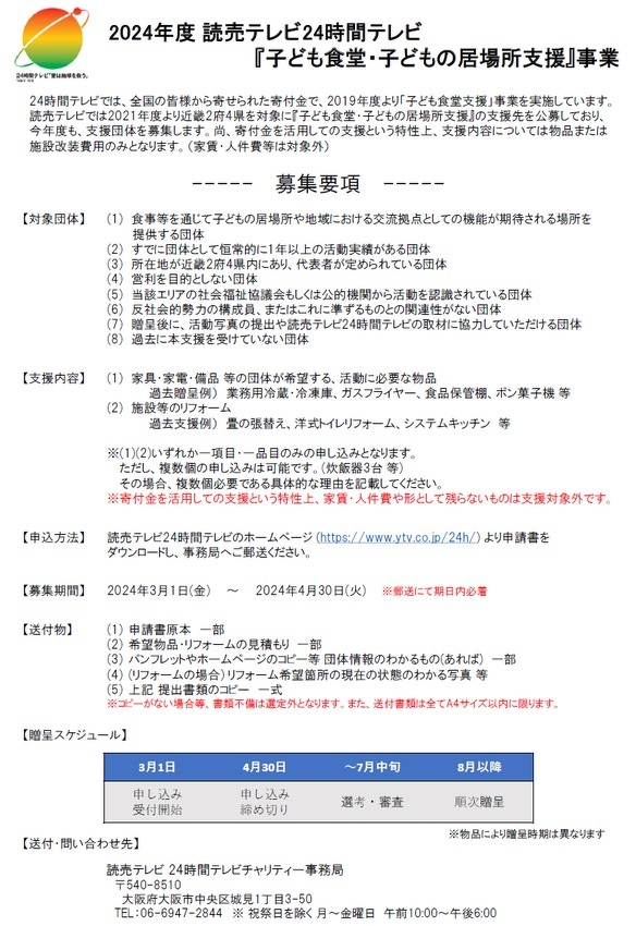 24時間テレビでは、全国の皆様からよせられた寄付金で、2019年度より「子ども食堂支援」事業を実施しています。食事の提供を通じて子どもの居場所や地域における交流拠点としての機能が期待される場所を提供する団体を対象として支援を行っています。