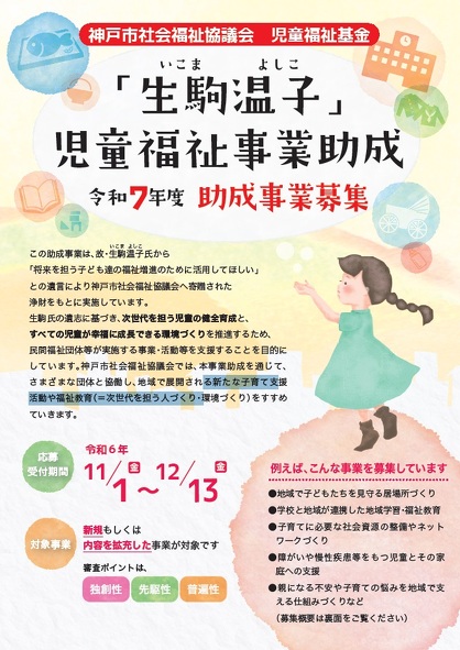 故・生駒(いこま)温子(よしこ)氏から「将来を担う子ども達の福祉増進のために活用してほしい」との遺言により神戸市社会福祉協議会へ寄贈された浄財をもとに実施しています。
