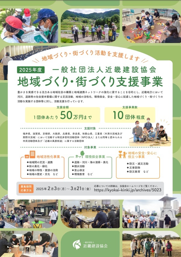 豊かさを実感できる活力ある地域社会の構築と地域連携ネットワークの強化に資することを目的とし、近畿地方において河川、道路等の社会資本整備に関する交流活動、地域の活性化、環境保全、安全・安心に配慮した地域づくり・街づくりの活動を実施する団体等に対し、活動支援を行います。