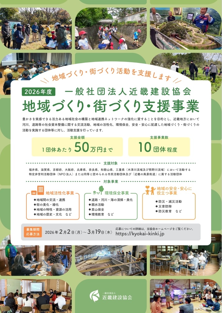 豊かさを実感できる活力ある地域社会の構築と地域連携ネットワークの強化に資することを目的とし、近畿地方において河川、道路等の社会資本整備に関する交流活動、地域の活性化、環境保全、安全・安心に配慮した地域づくり・街づくりの活動を実施する団体等に対し、活動支援を行います。