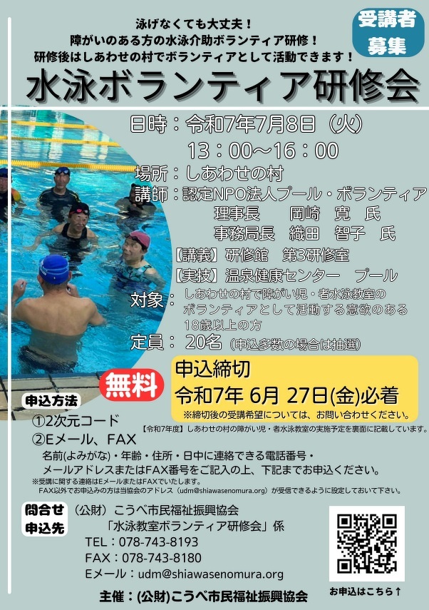 ■対 象:しあわせの村で障がい児・者水泳教室のボランティアとして活動する意欲のある18歳以上の方