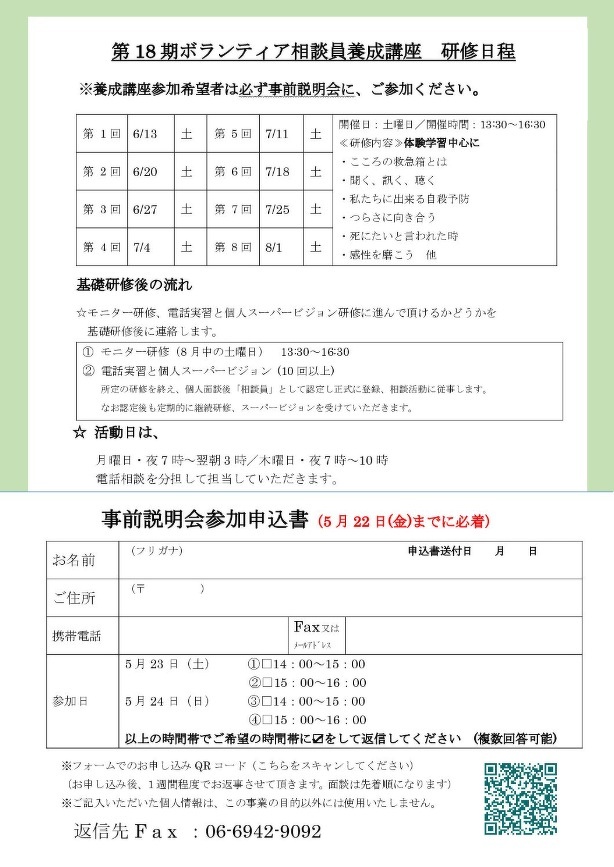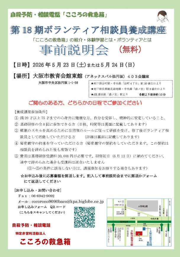 自殺予防・相談電話「こころの救急箱」 第18期ボランティア相談員養成講座の事前説明会を無料で開催します。