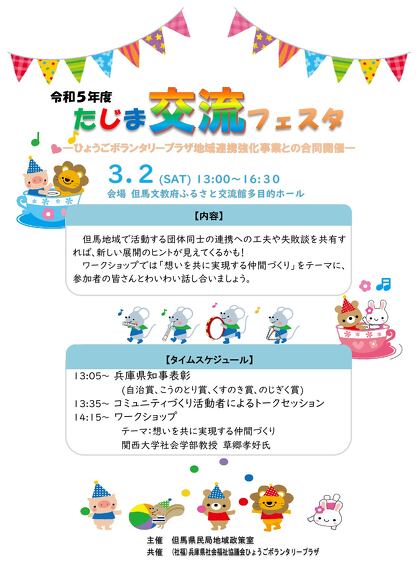 今年度は、但馬県民局主催の「たじま交流フェスタ」において行政と地域づくり活動団体をつなげ、但馬における主体的な地域づくり活動をさらに発展させるため、地域特性を活かした活動をされている方々による事例発表等を通して、団体相互の連携やノウハウの共有を図る地域連携強化事業を実施致します。