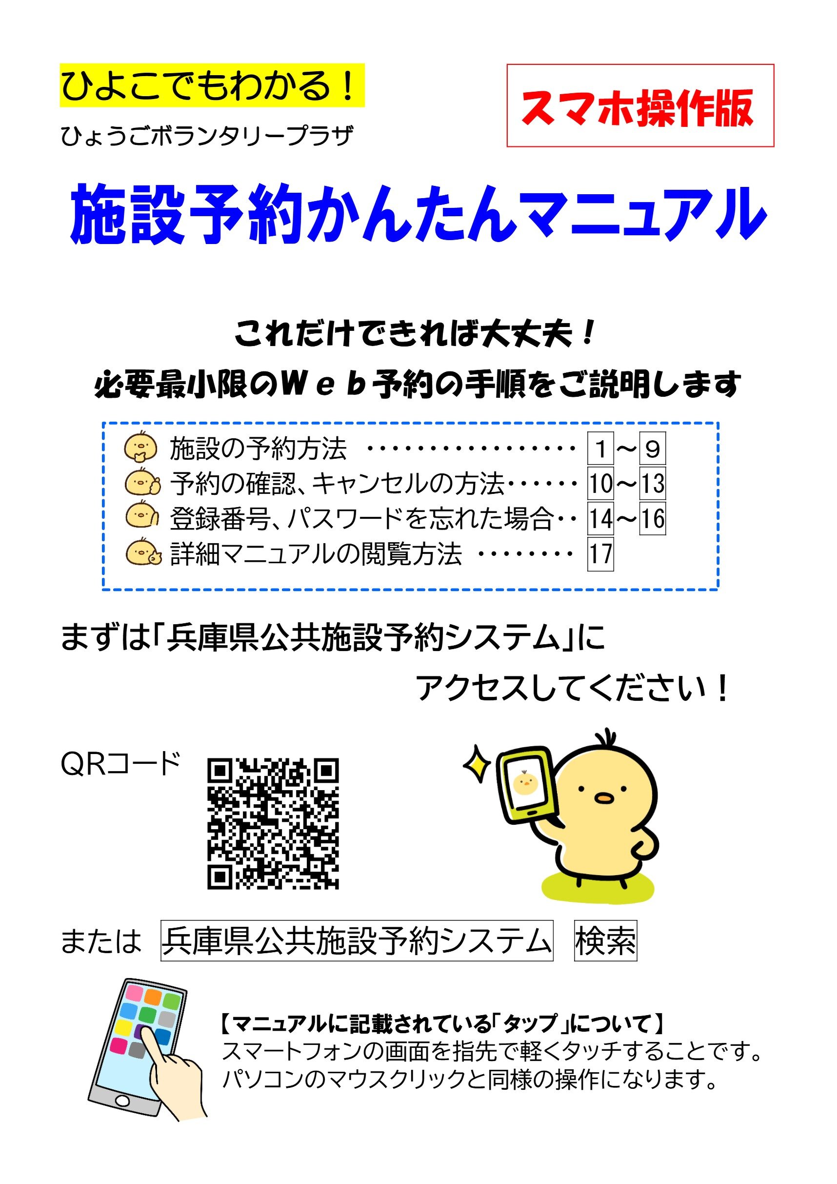 これだけできればボランタリープラザの施設を予約できますよ!という必要最低限の操作方法をご案内したボランタリープラザオリジナルのマニュアルです。パソコン版とスマホ版の2種類ご用意しています。