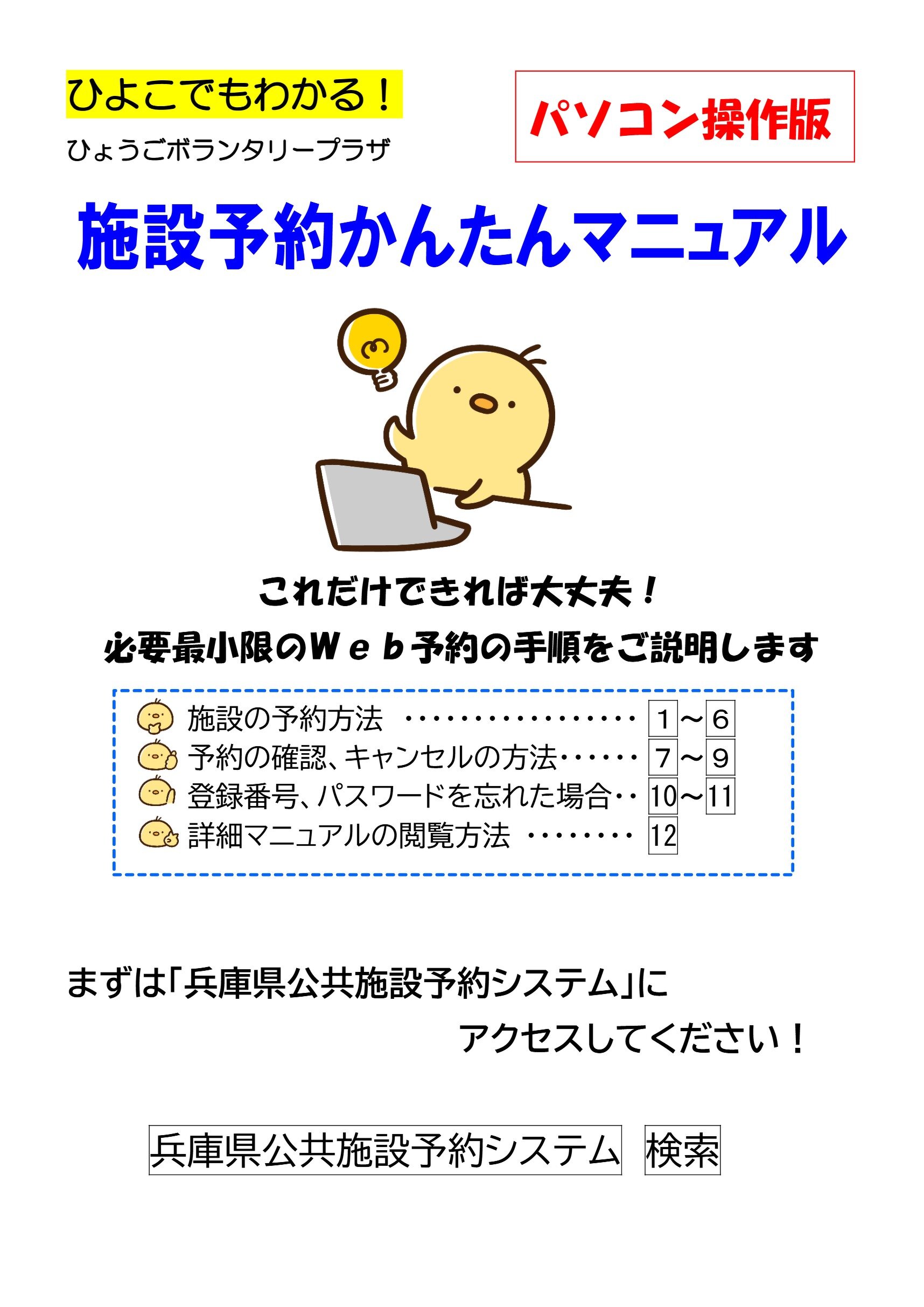 インターネットでのボランタリープラザの施設予約について、必要最低限の操作方法をまとめたオリジナルマニュアルを作成しました。ぜひご覧いただき、参考にしていただきますようお願いします。インターネットの予約については、兵庫県公共施設予約システムを利用しての予約となります。上の画面をクリックするとWebにジャンプできます。