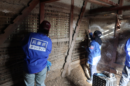 ①被災家屋の清掃、土倉の壁の泥落とし等